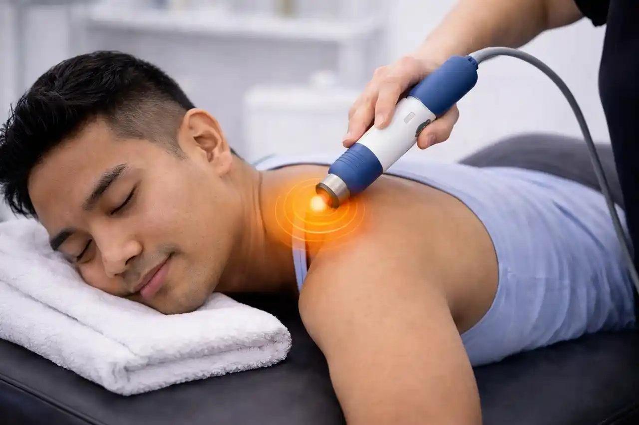 Shockwave Therapy is a non-invasive treatment that uses targeted acoustic waves to stimulate healing in injured or chronically painful tissue. It helps improve blood flow, break up scar tissue, and restore function.